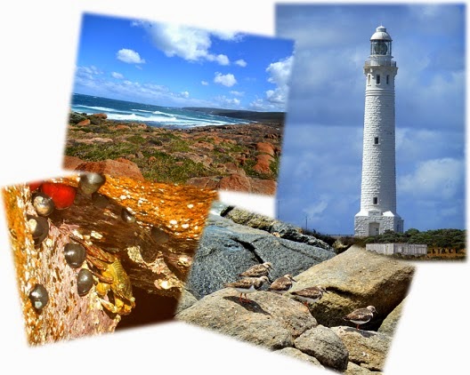 Top L to R: Leeuwin beach, Cape Leeuwin Lighthouse Bottom L to R: Yellow crab, Shore birds |